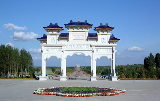 在内蒙古自治区西部的鄂尔多斯高原上,有一座巍巍然屹立着的蒙古包式建筑宫殿,这就是闻名遐迩一代天骄成吉思汗的陵墓。成吉思汗陵园位于鄂尔多斯高原南部,鄂尔多斯市伊金霍洛旗境内的甘德利敖包之上。1219年和1226年,成吉思汗两次西征.。当他率部路过此地时,深为这里的秀丽景色所吸引,曾在马上赋诗加以赞美,并把这里选作自己的葬身之地。1227年8月,成吉思汗出猎坠马而死,其遗体被运到这里安葬。从此,这里便被叫做“伊金霍洛”,意为“主人的陵园”。成吉思汗陵园里丛林茂密,芳草萋萋,鸟语花香。在这片宁静和谐的大草地中间,它以独具风格的相互连通的蒙古包大殿标示着中华民族史上威震天下、征服世界的一代天骄成吉思汗就长眠在这里。勇敢、热情、彪悍的鄂尔多斯达尔扈特人世代守护着自己的英雄。